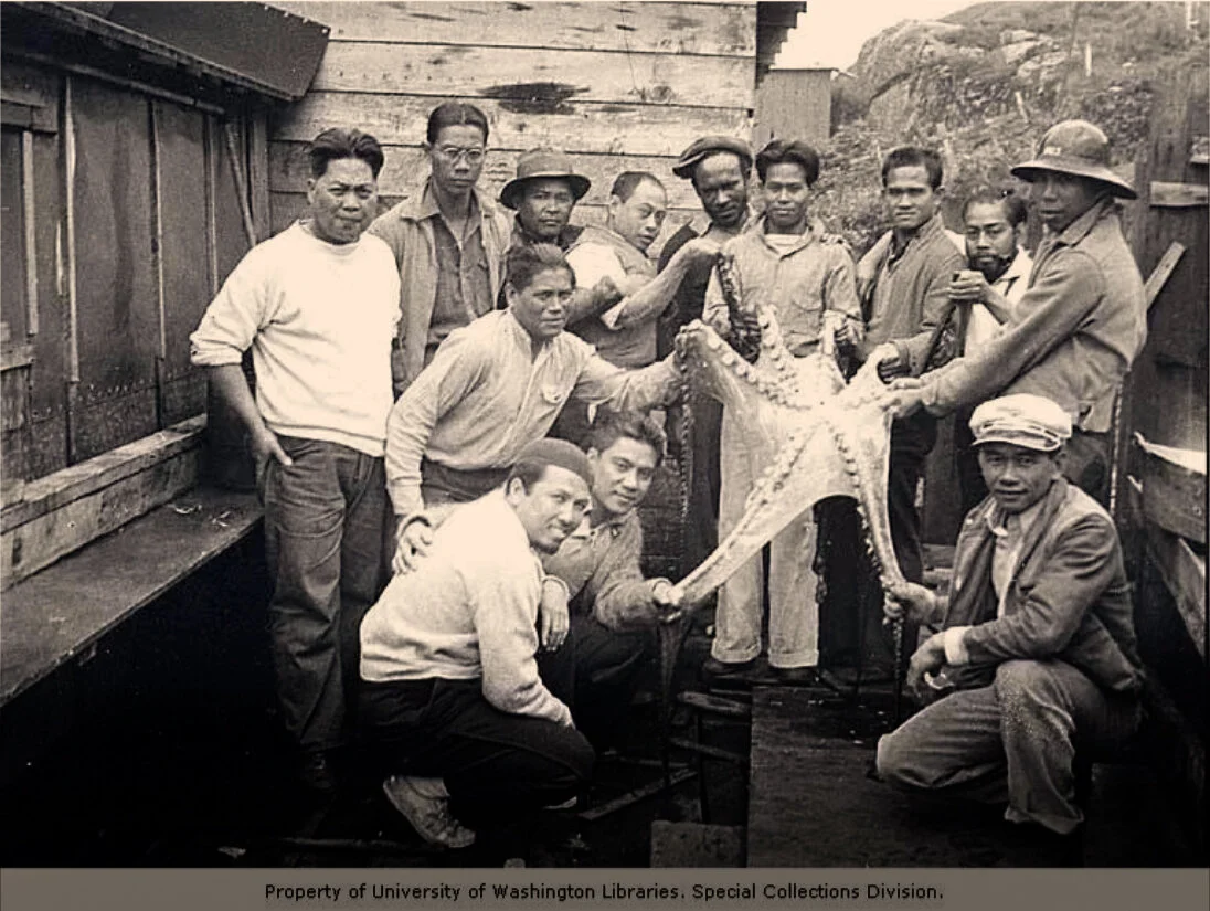 This led to the very first Filipino-led union ever organized in the United States: the Cannery Workers’ and Farm Labors’ Union Local 18257. Based in Seattle, it was organized by the “Alaskeros” who worked in the Alaska salmon canneries each summer and in the harvest fields of Washington, Oregon, and California in the other seasons. By 1937, CWFLU had integrated with the United Cannery, Agricultural, Packinghouse, and Allied Workers of America (UCAPAW) under the Congress of Industrial Organizations(CIO), becoming UCAPAWA-CIO Local 7, turning into Local 37 of the International Longshoremen and Warehousemen Union (ILWU) by the summer of 1950.